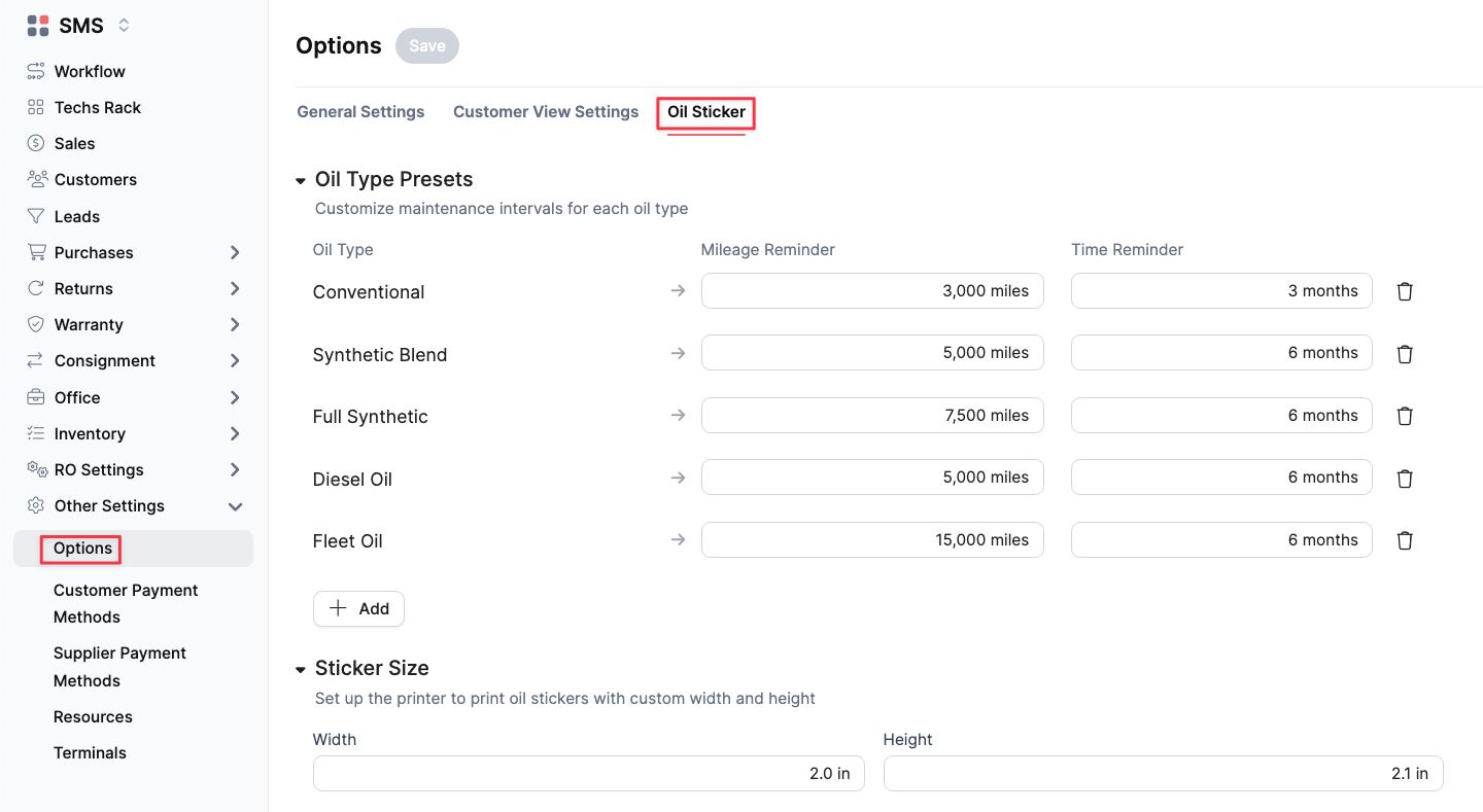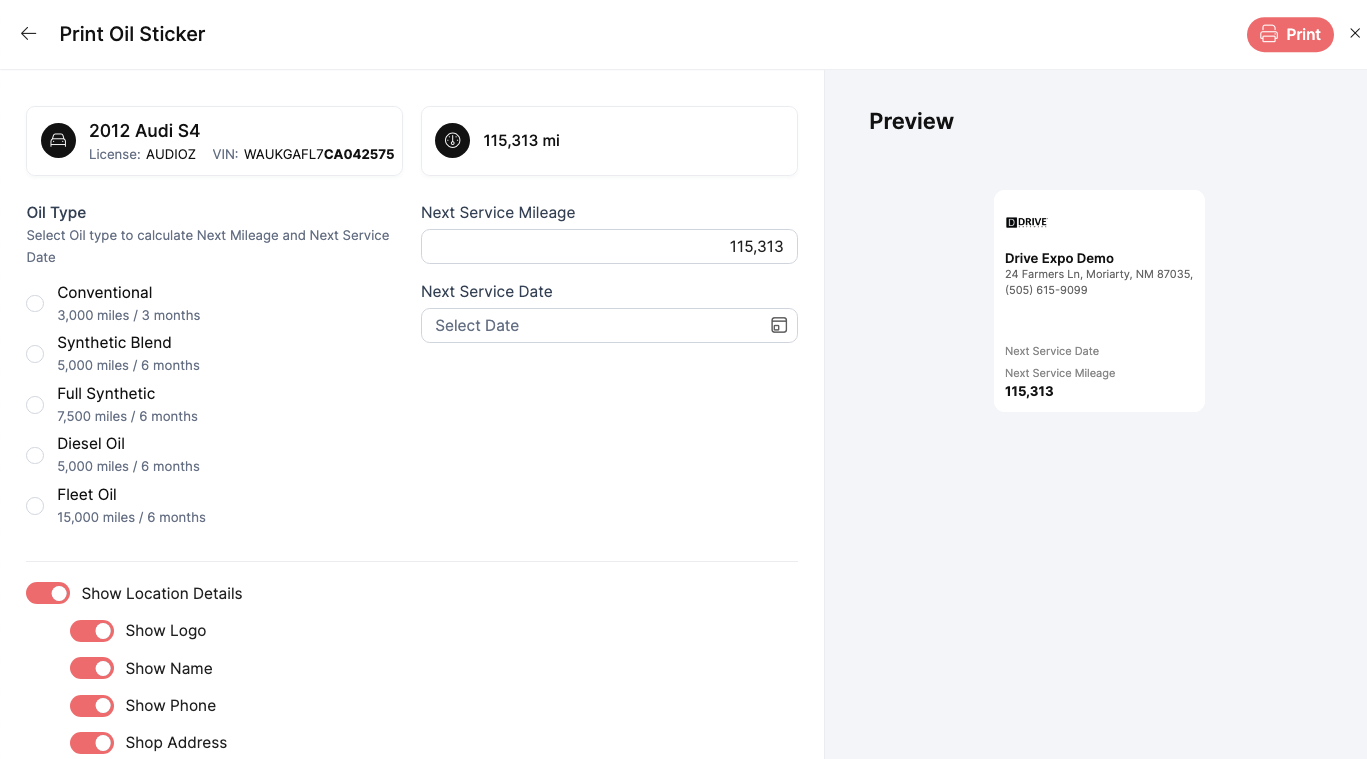 DRIVE SMS now supports printing customized oil stickers directly from your Repair Orders. This feature allows you to set maintenance presets and print stickers tailored to each vehicle's service needs.