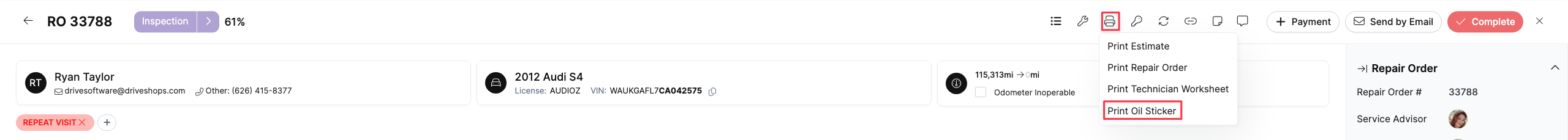 Once your settings are configured, you can generate a sticker from any active Repair Order: