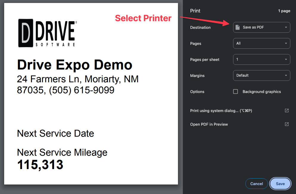 Select your sticker printer from the system's Destination menu and click Save or Print.